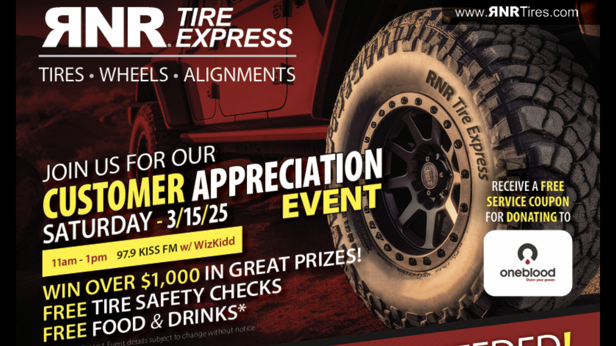 Bring the family by for Free Lunch, Tire Safety Checks, and register to win OVER $4500 in RNR Prizes and Gift Cards! One Blood will be on site donate and receive a RNR Service Coupon!