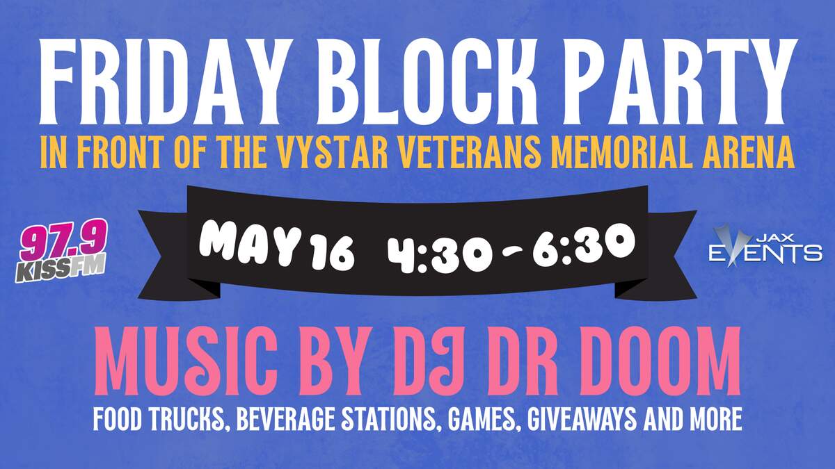 It's the Friday Block Party before the Forrest Frank show! In front of the VyStar Veterans Memorial Arena from 4:30p-6:30p on May 16th. There will be music by DJ Dr Doom, Food Trucks, Beverage Stations, Games, Giveaways and More! Thanks to Jax Events!